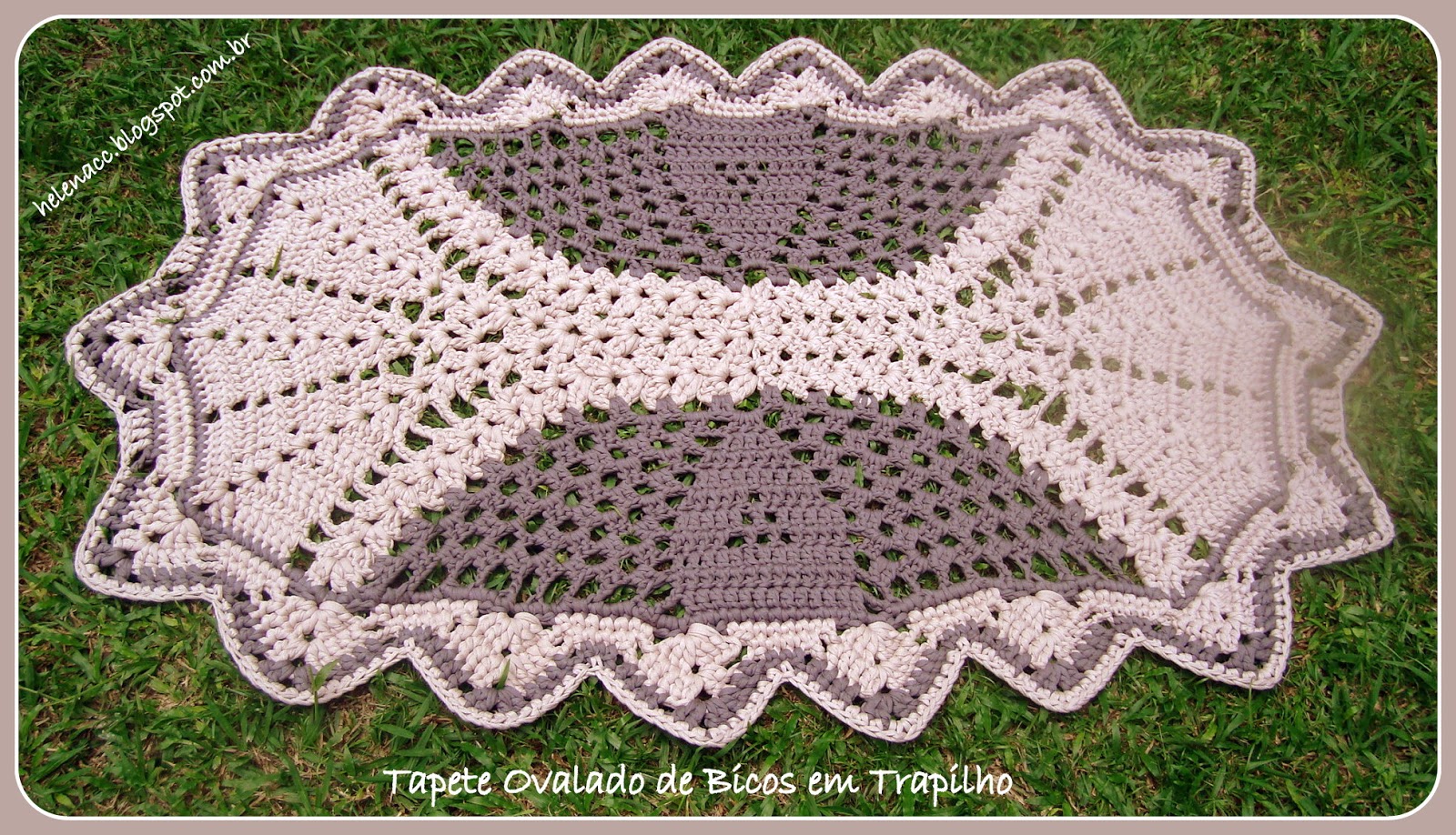 Um grande tapete de trapilho de forma meio ovalada e com bicos nas bordas. Em dois tons de marrom, um bem clarinho, quase cru e o outro num tom mais escuro.