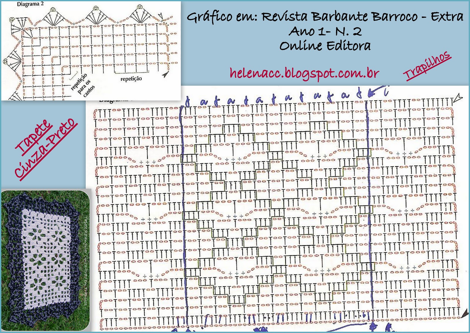 Um tapete de Trapilhos em Crochet Filet, com a base em cinza clarinho e a barra, estampada de cinza mais escuro e preto, em ponto rede com um biquinho para finalizar.